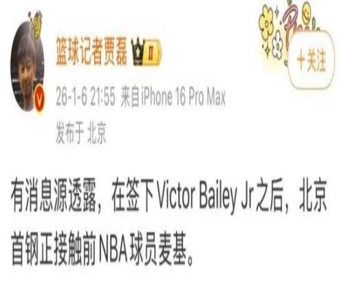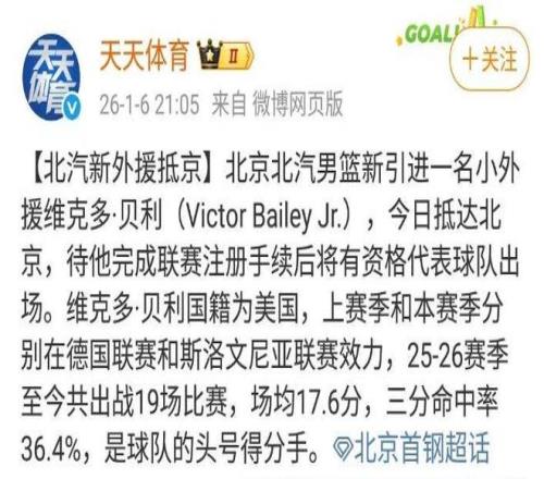 自从北京男篮裁掉了外援奥莫特后,很多北京球迷就对北京男篮会选择什么样的新外援非常关心,目前这件事有了确切的消息。而且对北京男篮来说,是非常大的惊喜。据北京媒体“天天体育”透露,球队签约的新小外援维克多-贝利已经抵达了北京,办完手续后就能代表北京男篮出战。另外据北京记者贾磊和知名媒体人“球圈赵探长”透露,北京男篮还在接触前NBA内线悍将麦基,如果一切顺利的话,麦基将会在春节后加盟北京男篮。