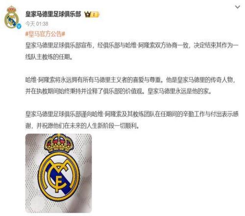 官方公告中表示,经俱乐部与哈维-阿隆索双方协商一致,决定结束其作为一线队主教练的任期。